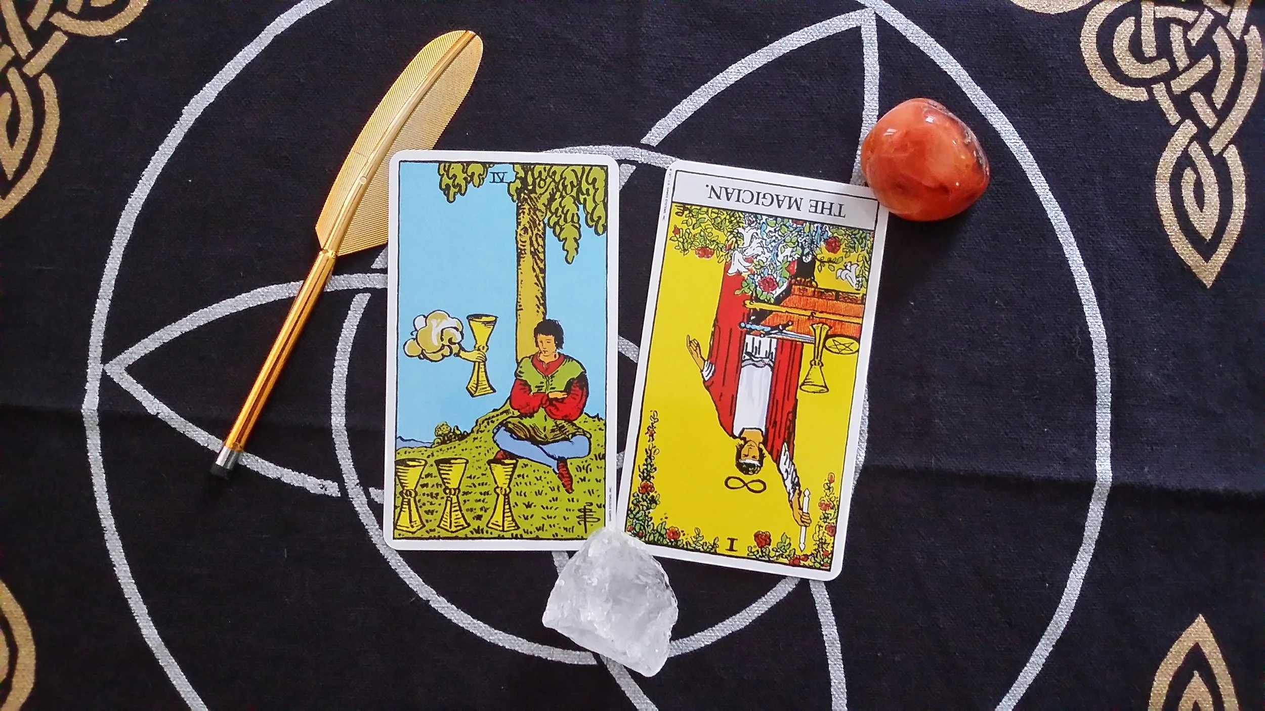 Let's start with the 4 of Cups, we know that the Cups speak of emotions, flow and Spirit. The man sits in dissatisfaction with his arms folded and eyes closed. He has 3 cups before him and another being offered from Spirit. He sits in his own self wallowing not appreciating what he has nor is he open to receive the blessings being bestowed upon him. Now let's look at The Magician. Reversed, this represents us not being in our power. We are not using our tools and power to create our desires. Something within us is a bit out of sorts and we need to come back to center. We need to remember our part in the magic of manifestation. This is very fitting following Mondays Message this week!